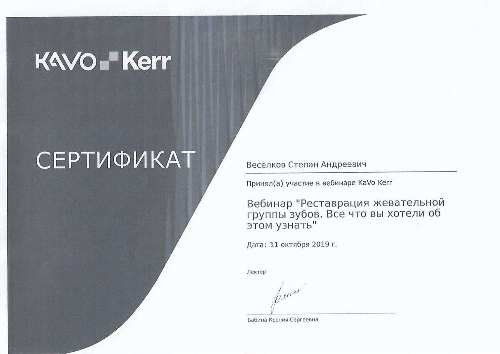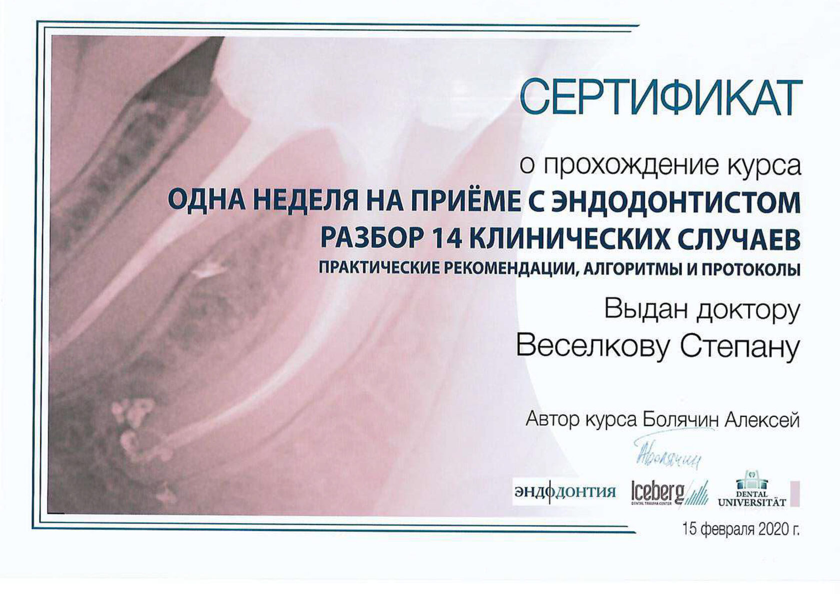 - 2022 Смоленский государственный медицинский университет (стоматология) Базовое образование - 2021 «3D-School. Основы работы с Ondeman 3D», Мальцев А. (Повышение квалификации) - 2021 «3D-School. «Bend Stomatology» по теме «Синус-лифтинг», Курносов Г. (Повышение квалификации) - 2022 Практический семинар Королева Ю.Л. «Знакомство с Dentium: Как установить свой первый Implantium&SuperLine» (Повышение квалификации)
