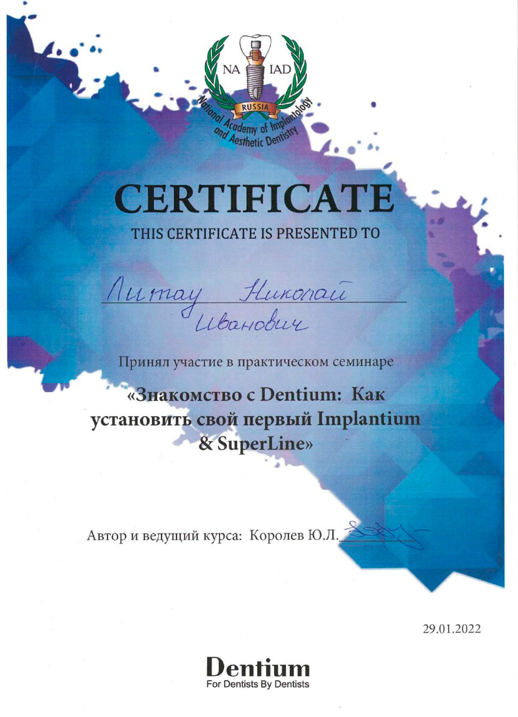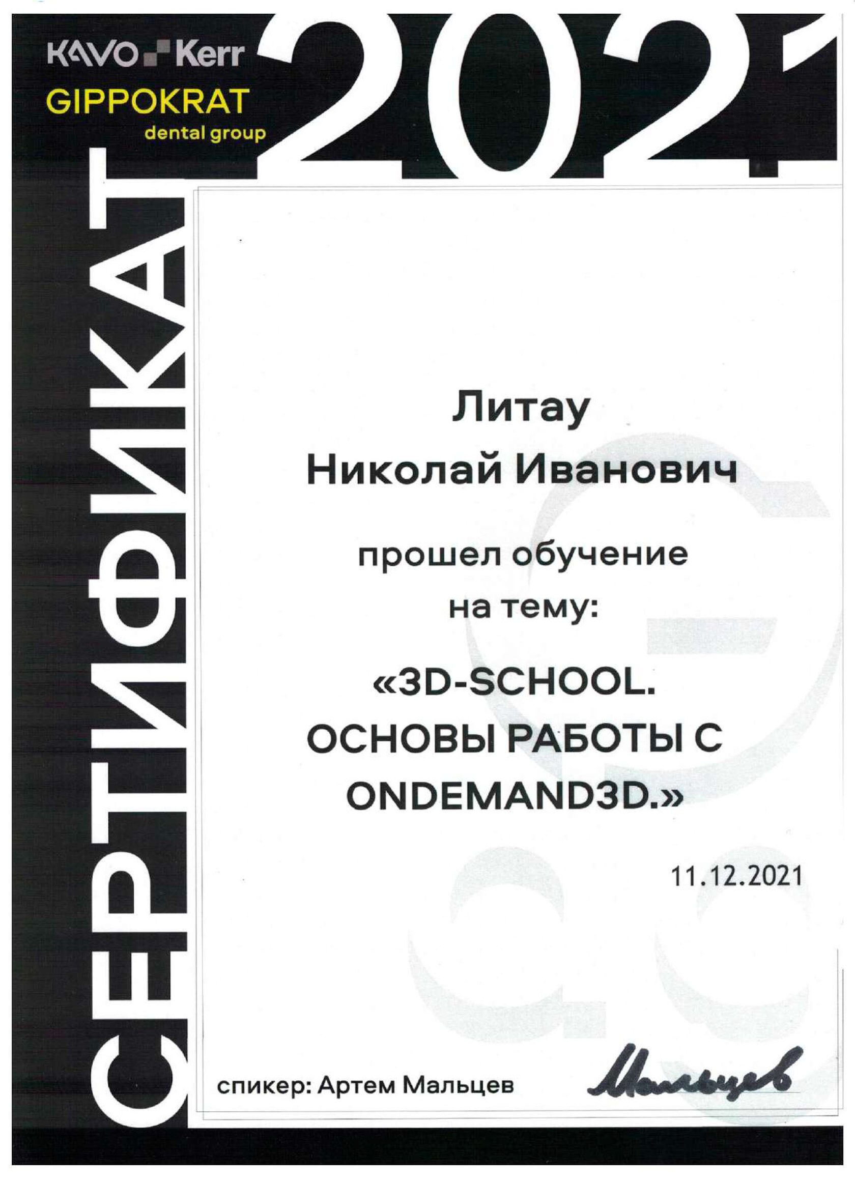 - 2022 Смоленский государственный медицинский университет (стоматология) Базовое образование - 2021 «3D-School. Основы работы с Ondeman 3D», Мальцев А. (Повышение квалификации) - 2021 «3D-School. «Bend Stomatology» по теме «Синус-лифтинг», Курносов Г. (Повышение квалификации) - 2022 Практический семинар Королева Ю.Л. «Знакомство с Dentium: Как установить свой первый Implantium&SuperLine» (Повышение квалификации)